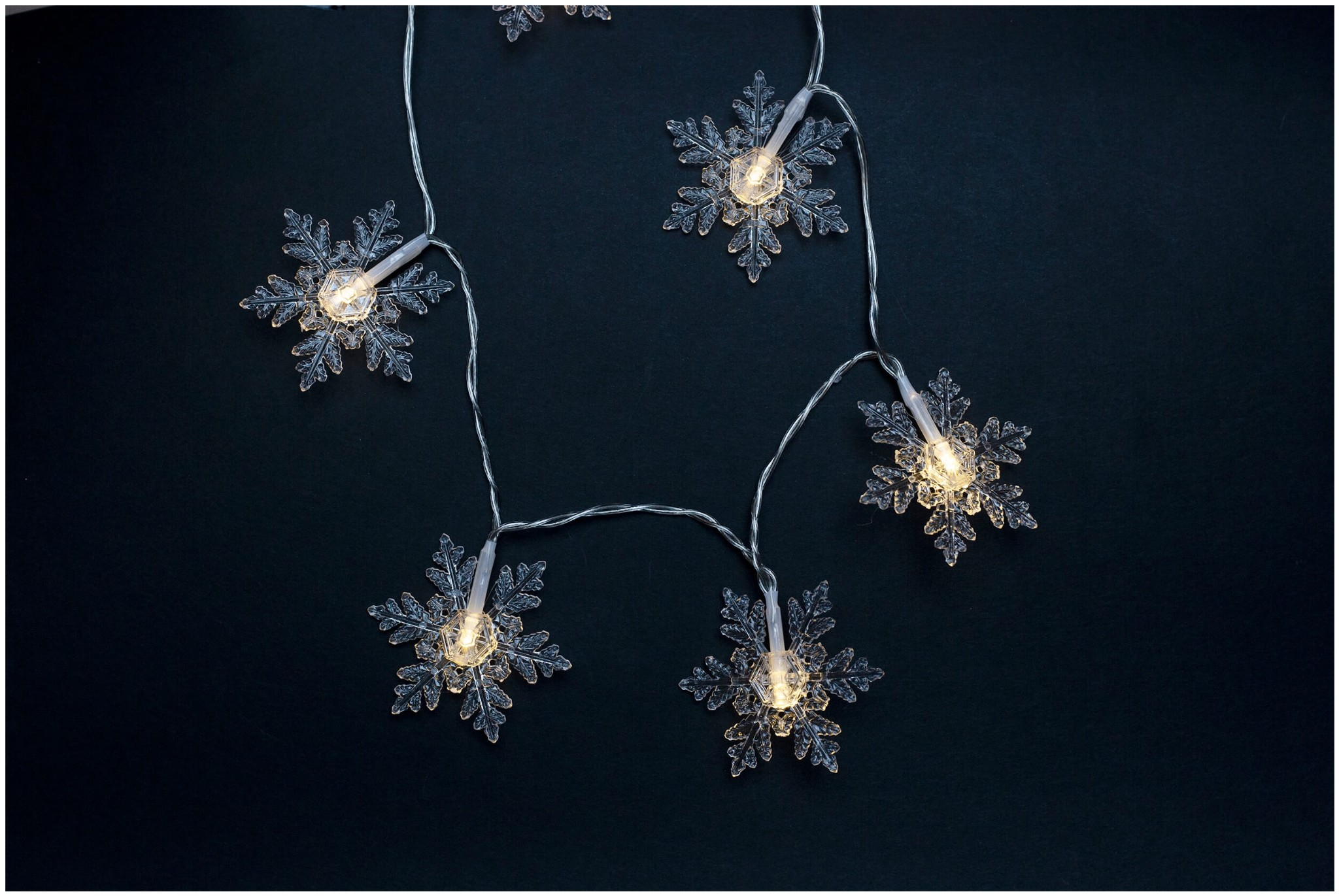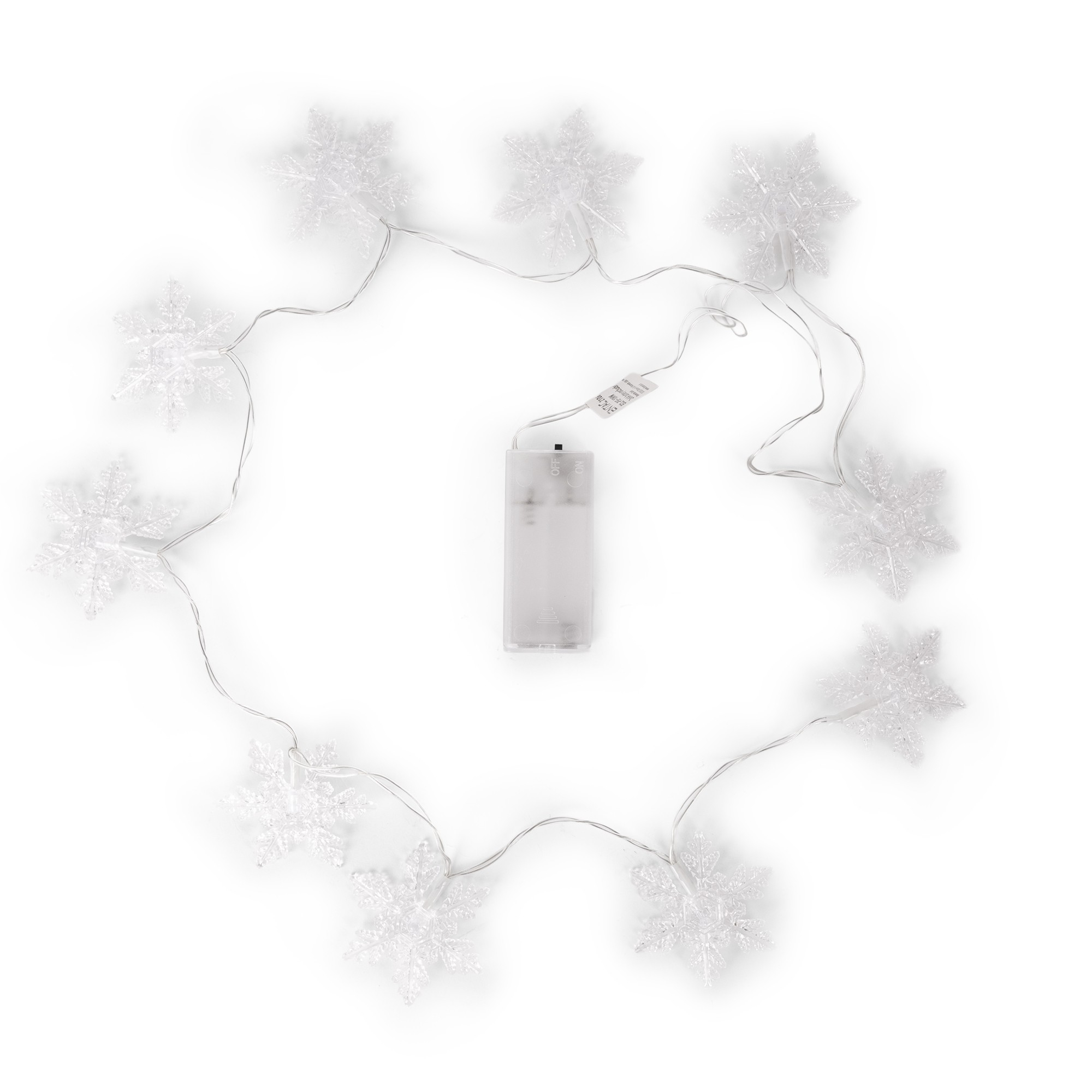 Our Christmas plastic snowflake lights are available in a warm white (WW) color temperature. The 1-meter long string features 10 LEDs, while an additional 30 centimeters of cable ensures convenient access to the battery box. The product works with 2 AA batteries not included in the package.