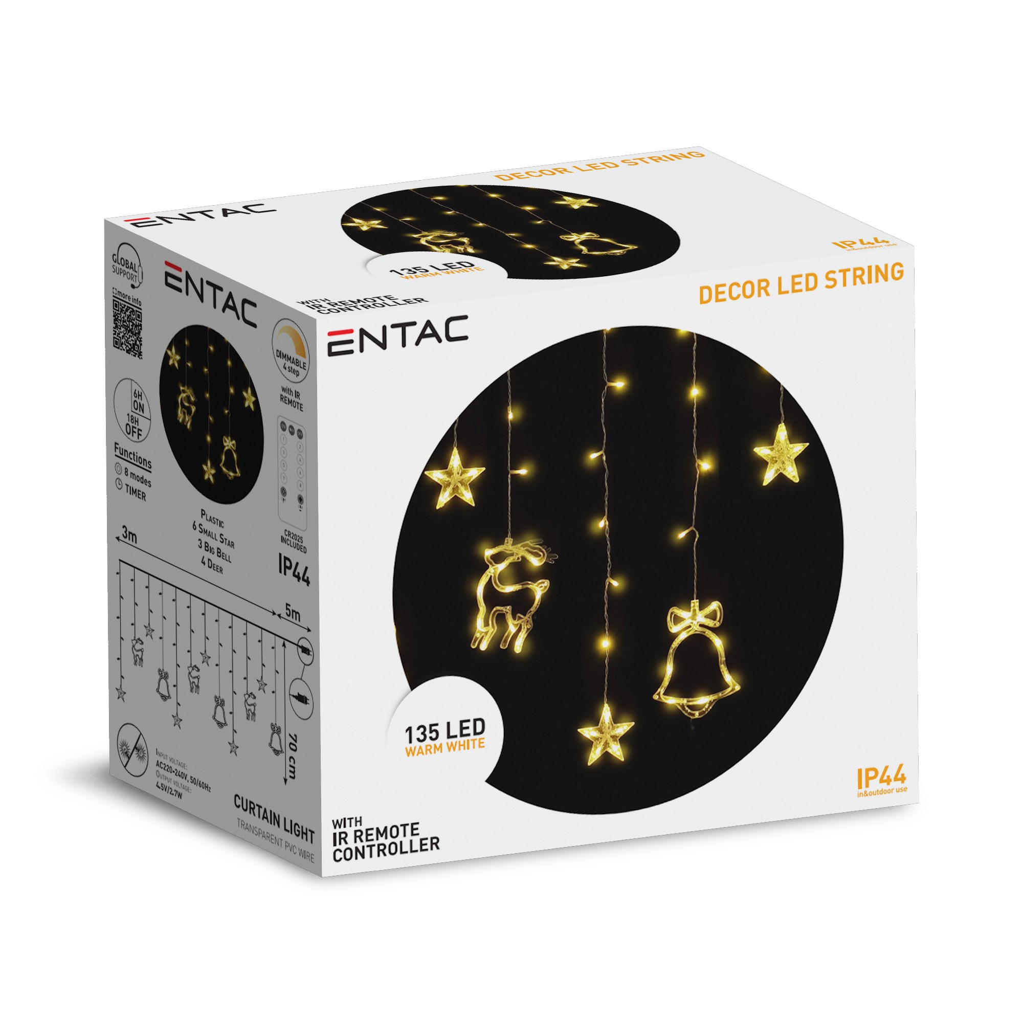 Entac Karácsonyi Függöny IP44 WW 135 LED 12db Dísz Csengő és Rénszarvas 8F + időzítő 3x0,7m IR távirányítóval