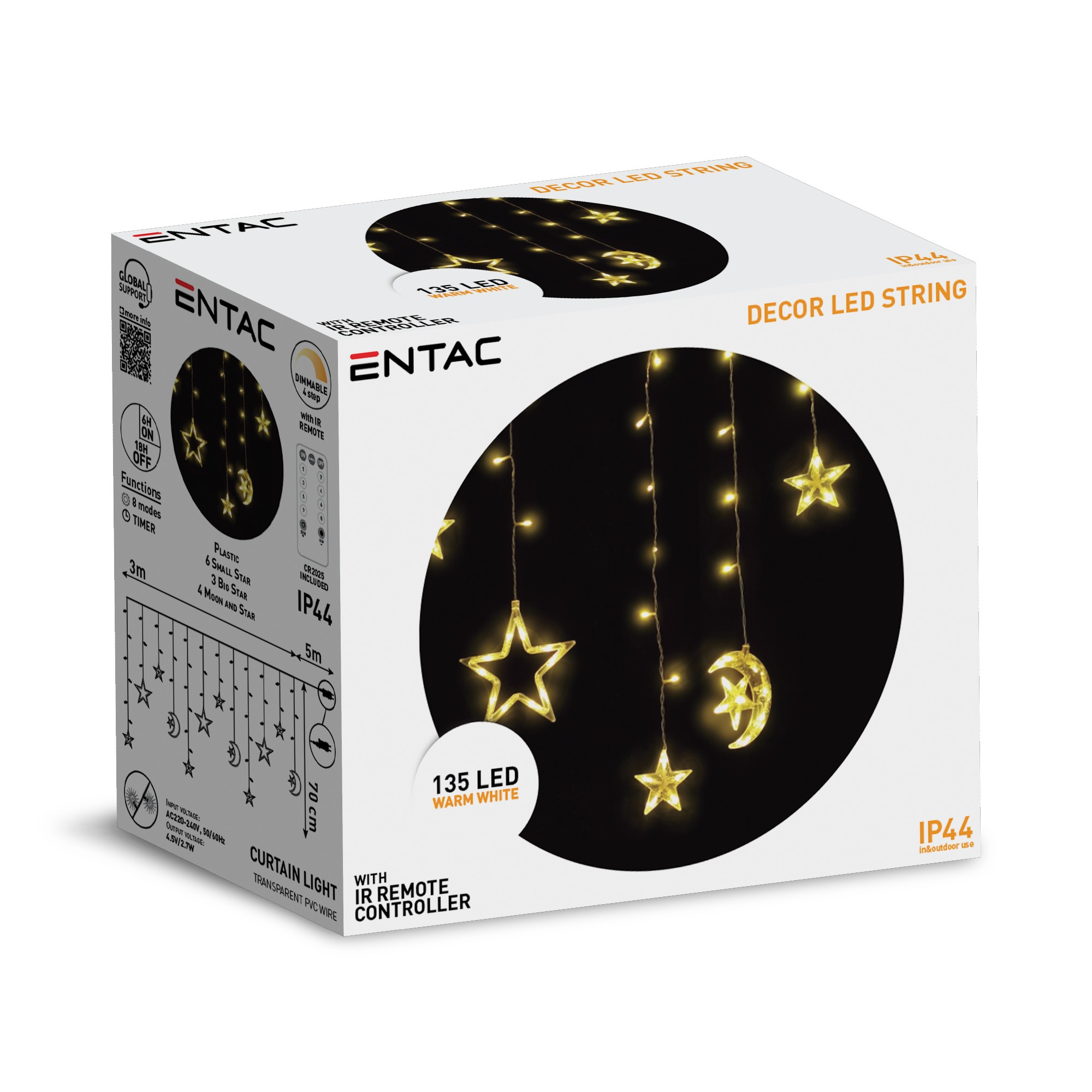 Entac Karácsonyi Függöny IP44 WW 135 LED 12db Dísz Csillag és Hold 8F + időzítő 3x0,7m IR távirányítóval