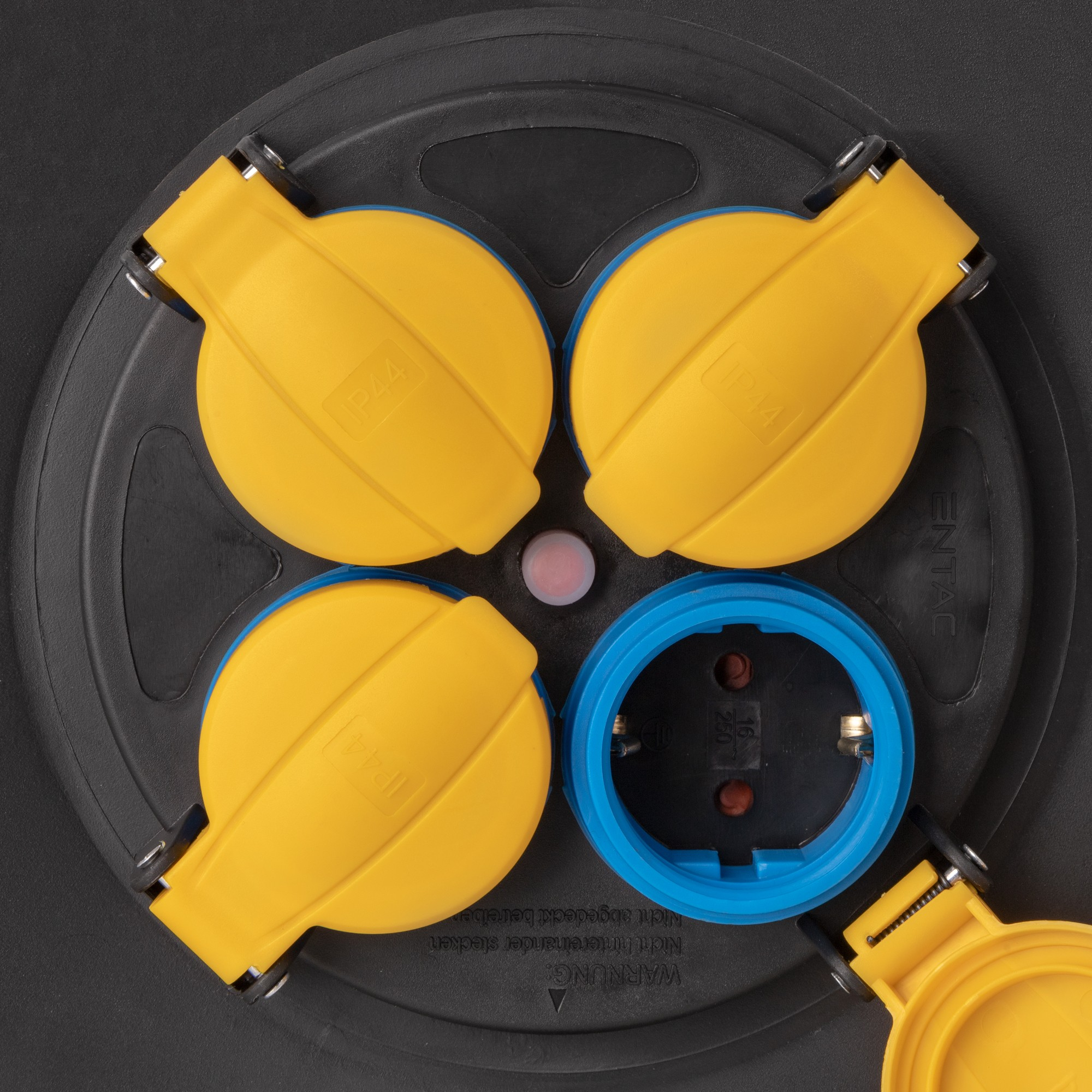 H05RR-F 3G1.5mm The Entac extension cords with a cable reel are indispensable both at work and home. With their help you can provide electricity for all of your electric devices even if the power source is located further away. The 4 earthed sockets on the cable reel provide power for several machines at the same time. In the IP20 version we offer 25 and 50-meter-long extension cords, while the IP44 version is available in 25 and 35-meter lengths, with a 3G1.5 cable type. The IP44 extension cords are also suitable for outdoor use due to their water and dust-proof properties.