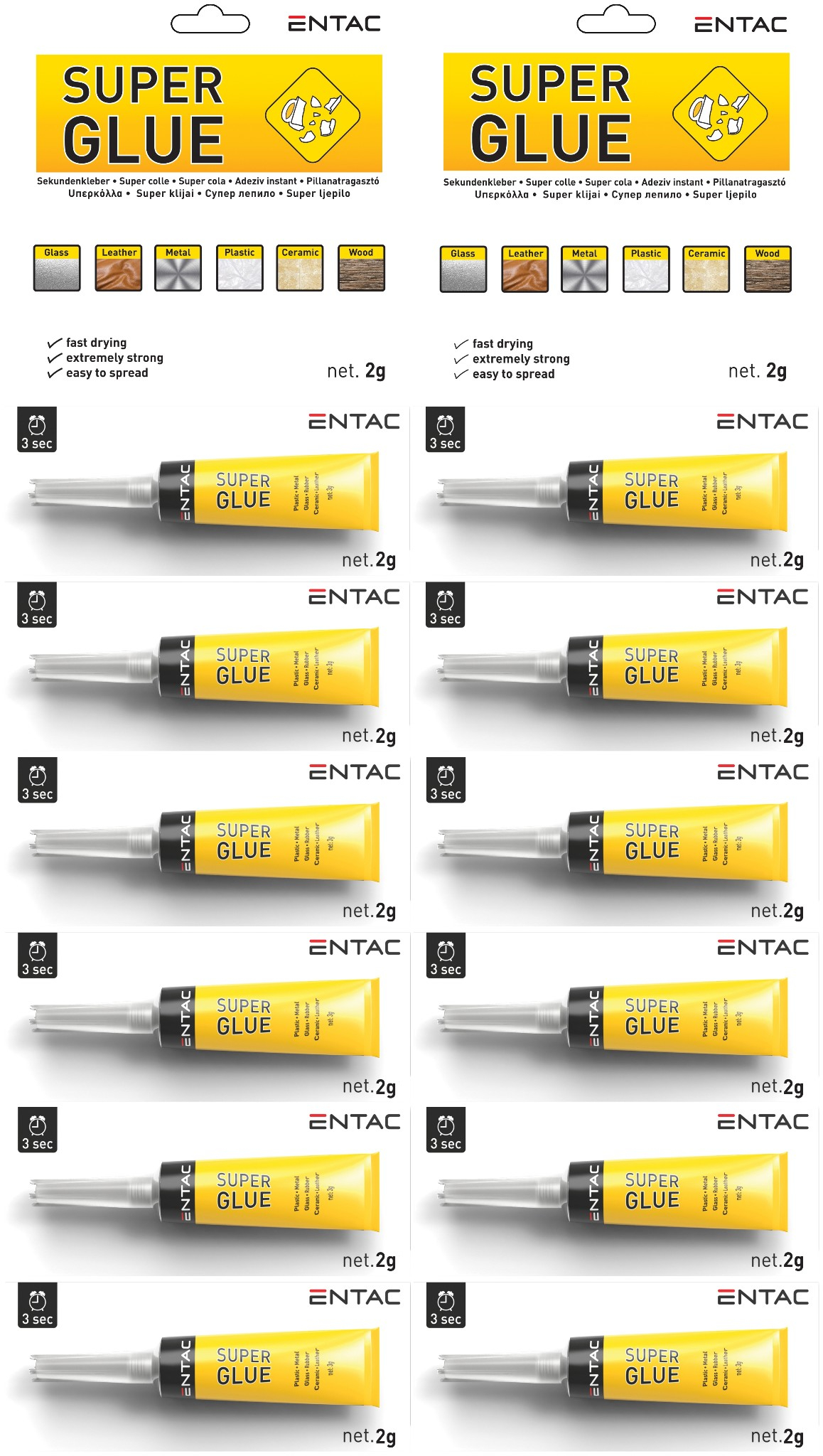 Az Entac Superglue pillanatragasztói elengedhetetlenek a háztartásokba, a különböző tárgyak gyors és egyszerű ragasztásához. Erőss, hosszantartó hatást biztosít, ezáltal meghosszabbíthatja kedvelt eszközeink élettartamát. Univerzálisan használhatóak fa, fém, üveg, műanyag, bőr és kerámiák javítására is. Megtalálható folyékony állagban 2 és 3 grammos, illetve gél állagú 3 grammos kiszerelésben.